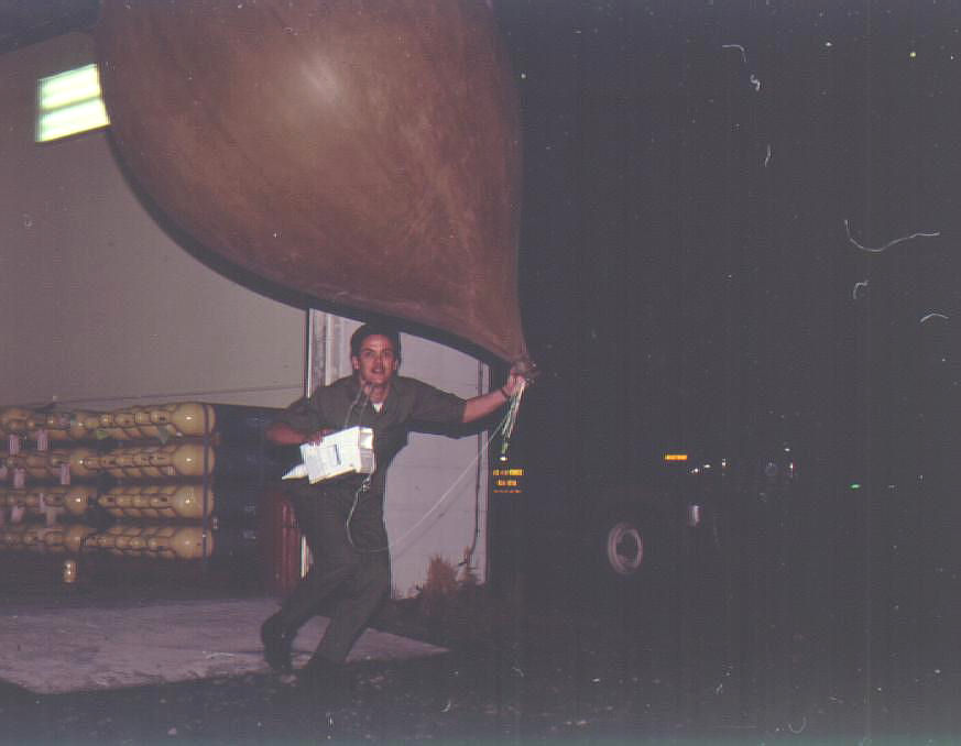 That’s the photo you see: one he sent me. But it’s like I’m looking at a scene from my own life. That boring concrete brick shack with one wall a garage door on a pulley makes my heart lurch. The action shot: there’s no way the person could walk out without having the balloon crushed into the building from the winds. So it was the crouch, run, and toss sequence I see there. And the uniform is fatigues. That’s what I wore before the Air Force switched to issuing the camouflage BDUs (battle dress uniforms) we are all so familiar with today.