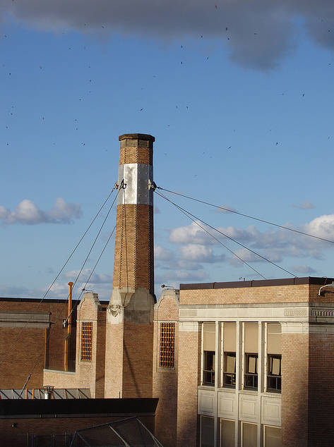 The chimney was maintained for the Vaux’s Swifts, however. These birds are well-designed for flying and not well designed for holding still. They can’t perch, but are good at clinging to vertical surfaces. They fly around all day long eating tens of thousands of insects, then when the sun goes down, they pour into the chimney to roost there for the night. Portland hosts the largest known swift migration stop in the world, and the Chapman School chimney has held up to 40,000 birds at once!