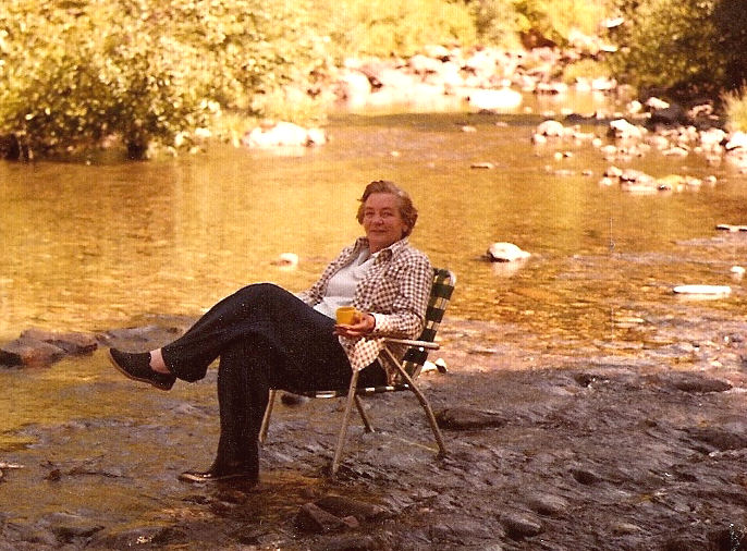 We’ve got this picture of Gramma in her chair right in a river. She’s got her pant legs wet, with her bare feet in the moving water, and a coffee cup (probably filled of whiskey and ice). I can’t remember where that was taken. Maybe it was one of the times she camped with us at Brownlee Dam on the Snake River.
