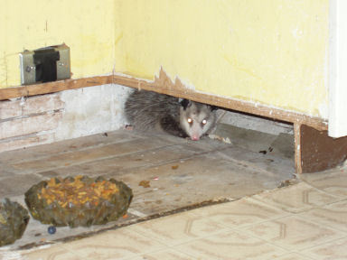 The critter had come in to eat cat food. Knew right where to go, I guess, which makes us think it was not visiting us for the first time. I leave the door to the basement/kitchen/outside open all night some nights, to keep the air moving through. It must have come up the stairs for a treat.
