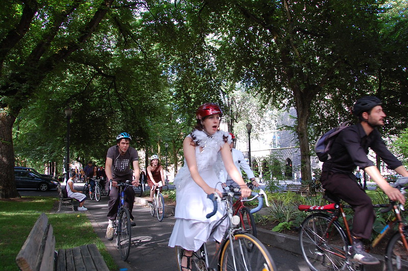 It’s an awesome sight. Super athletes in their Tour de France yellow, in cut off cords and Converse sneaks, in pigtails and short skirts, shirtless, shirt-and-tie… I’m telling you – everybody is on a bike around here.