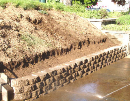With the trench dug, I nabbed a couple of levels and started to work. I carefully leveled the 12 inch bricks front to back, and leveled them side to side, and leveled them according to the brick before. Mark finally commented after awhile, “This job is perfect for you.” I think it was a polite way to call me anal-retentive. The first row took about an hour. My excessive leveling paid off because the next three rows took twenty minutes.