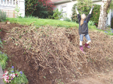 We live in one of those Portland homes that sits on a hill above the sidewalk. Ours is a rather steep hill, and it makes sense that the previous owners were happy to leave the hillside covered with invasive ivy. And leave it for oh, say, twenty years or so.