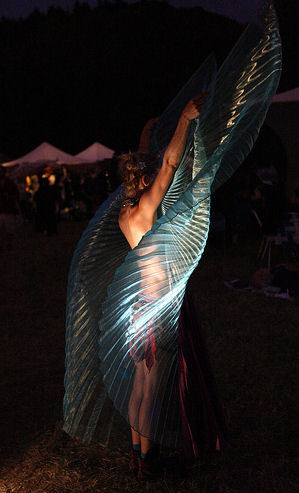 Saturday morning we played dress-up till we had our outfits planned. I brought T’s wings from last year, and a whole suitcase full of faery finery. My monarch wings finally fell apart last year, so this year I planned to splurge on new wings. T’s wings are green and gold and blue gauzy huge wings that attach to her neck and wrists and flow when she lifts her arms. Saturday promised to be even hotter than Friday, and we chose our faery gear with that in mind. Still, I knew that no amount of planning can make 95 in the shade seem cool.