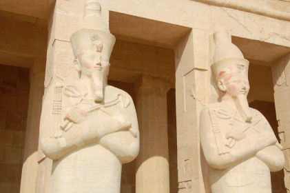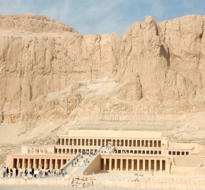 Her temple was remarkable. It is set into a cliff face, three stories high, and looks out across a low slope into the valley (wadi, in Arabic). From the parking lot, the huge temple dominated our view during our walk up to it. There remain the stumps of two frankincense trees at the entrance, which Pharaoh Hatshepsut brought back from her travels in Africa. Her temple is in poor shape mainly because her nephew/stepson Thutmosis III was her successor. He hated her and went to great lengths to destroy her works all over the Nile valley. Where he couldn’t break an image, Thutmosis III had any references to Hatshepsut chiseled off the walls.