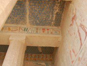 I was stunned to wordless- ness (yes, I know, hard to believe!), but I’ll try to put something down for you. Here we saw the most pristinely preserved hieroglyphics yet. The colours were incredible; the detail awe- inspiring. I could not believe the quality of preservation of the painting! It looked as though the artists were in there last month. In five minutes I identified a dozen different birds in hieroglyphics, each with amazing detail of colour variation and individual feathers painted. Women had straight, wavy, curly, and kinky hair, with earrings and painted fingernails. I could count the scales on the fish. It was truly humbling. The ceilings we saw in every tomb and temple had a blue background with stylized gold stars painted in a pattern. I’ll recognize that design forever.