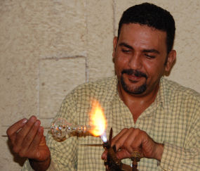 Next we stopped at a perfume factory. Since scented oil was an extremely valuable commodity in Ancient Egypt, I consider this a relevant stop. But I’m not a big fan of scents. We had a demonstration of glass-blowing, while an artist created a delicate vessel in which to hold oils and a glass stopper with which to dab on oils.