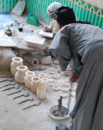 It was noon and we were so hungry, but before lunch we went to an alabaster factory. It was interesting to me that vases and bowls are actually carved from stone by patiently grinding a hollow into them, and then grinding and polishing till smooth. We saw a demonstration in which the alabaster was buried to the lip in the dirt on the floor of the workshop. Differently-shaped carving tools (think router bits) were inserted into the hollow, and with a long handle attached, a man twisted around and around, continuing to carve and shape the inside of the bowl.