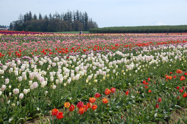 Here’s an inside tip: arrive early. When we left at 1:30pm, we passed cars lined up to get in. They were bumper to bumper from the gates of the tulip farm and along the 2 miles to highway 211/214. They sat in line for another 4 miles of highway and through the city of Woodburn, down the ramp from I-5, and a couple of miles along I-5. Moral of the story= arrive early. Gates open at 9am. We got there about 10:15 am and didn’t have to wait in traffic at all.
