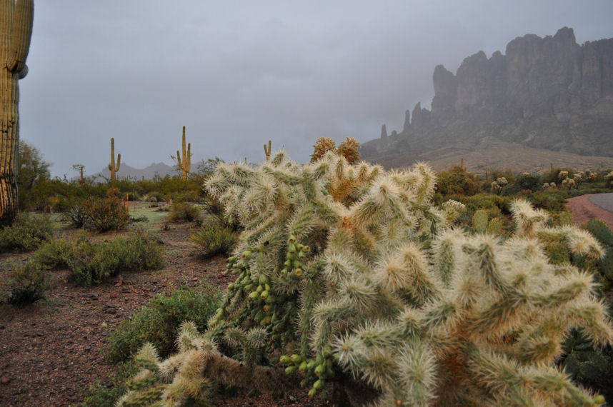 The agony through the city was worth it, however, because my choice of camp spot for the night was excellent! The park is a showcase for some of the most that a desert has to offer: craggy peaks, saguaro cactus, teeming bird life, orange rocks. I still couldn’t see much of the Superstition Mountains, towering above my tent, shrouded in ragged stratofractus and grey fog. I crossed my fingers that the next day would stop raining so I could see the whole mountain.