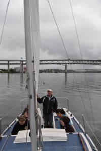 Then graduation on Tuesday night (my last blog post). For a celebration of the beginning of summer, Tara and I took an hour and a half sailboat cruise on the Willamette with Scovare Expeditions, Inc., and Captain Shane St. Clair. It rained part of the time, but stayed relatively warm, and the tour was a delight. Capt. Shane took us from our launch at the Sellwood Bridge, north to downtown Portland, and back again. He was able to give us some great background information about the river, the islands, the houseboat communities and particular structures we passed. He told bad jokes, kept us on our toes, laughed off the rain, and generally kept us entertained the entire trip. It was over entirely too soon. I had a blast snapping photos, and if you’re interested, you should check them out on my flickr page. I highly recommend the company, the captain, the 90-minute cruise!