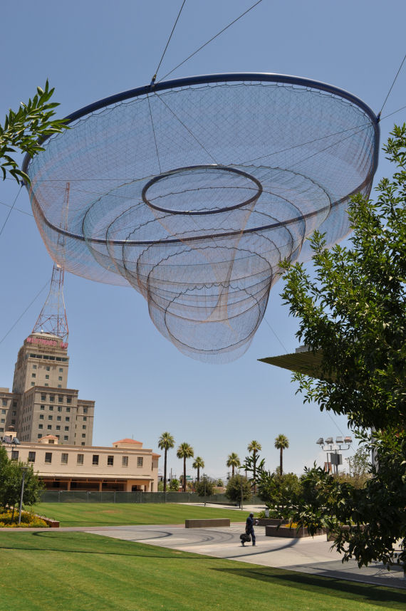My first Saturday here, I had the hotel shuttle drop me off downtown. I was a trooper. I wandered along the empty sidewalks for a good four hours and came up with nothing that more than mildly captured my interest. There are some nice buildings, a weird loopy net thing in the air, a bar with outdoor seating that had misters (misters are nice), and a multiplex theatre that could actually come in handy if I get bored. I gave up and called the shuttle to come get me.