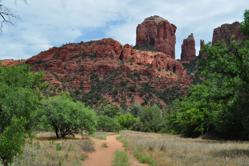 The beginning of our trail, with Cathedral Rock in the background. The saddle between the large rock tower back center, and the small tower just the to right of it, is where our trail ended. The volcanic rock is in the next saddle to the right.