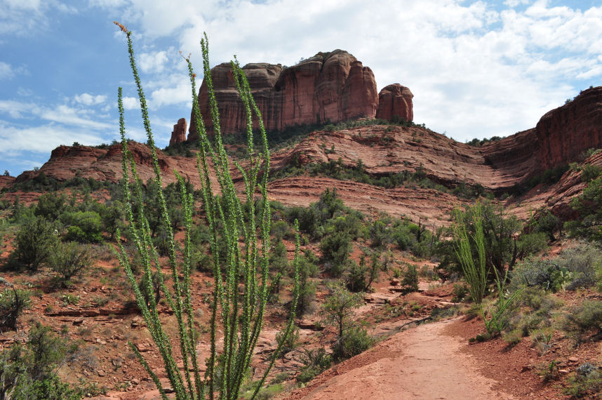 We were on the road relatively early and made our first stop at a U.S. Forest Service Visitor Center just south of the Village of Oak Creek on highway 179. It was the perfect first stop, and we received immediate personal attention once inside. Coconino Forest employee, Norris, asked a few key questions and then made his recommendation that we hike the Cathedral Rock trail. He said he’s been on them all, and this one is his favourite. He pulled out photos from the trail, and gave us large scale maps as well as zoomed in maps, and marked how to get there from where we were. He gave us hiking tips, reminded us to drink lots of water, and then recommended a place to eat because we were starving! If we had any extra time, he added, there was a viewpoint not to be missed, north of Oak Creek and near the airport. We should also stop and see the Chapel of the Holy Cross. He gave us meticulous directions to those attractions, as well. Finally, Norris took our photo with the eye-catching Bell Rock and Courthouse Butte in the distance, and sent us on our way.