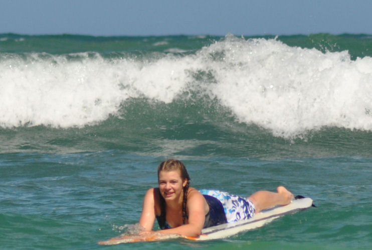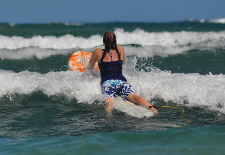 Sadly, the conditions were poor and our skills were weak as we tried to catch the sad little waves that did present themselves. Tara and I both managed to catch waves and ride a little, but it was only after a great amount of effort and thus the payoff was not what it could have been. My girl was determined, and spent at least four hours in the water, off and on, trying to coax herself into the path of something rideable. She ended the day very tired and frustrated, which was just too bad, considering our location and the unlikely prospect of returning any time soon. It made me think, for only a moment, that we should have joined the hordes at Waikiki on day one.