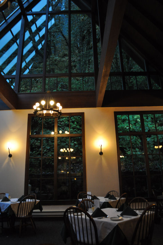 Inside is a real, honest to goodness, park lodge. For dining we could sit in either the fireplace room or the vista room. I chose the vista room and we were seated. This place is stunning; I can’t wait to go back. We didn’t really have time to eat dinner, and we were both driving so we didn’t order from the extensive wine list. Instead we had coffee and stuffed mushrooms and talked as the wet dripped from us. Such a gorgeous setting. Even the dishes were beautiful: antique china with a dogwood pattern. The cups, plates, saucers, all matched in dogwood blooms. The walls were stone and mortar, and in the vista room: glass glass glass. So we could look out at the stunning cliffs that hold the falls. Too much foliage: couldn’t actually see the falls. We will come back in winter.