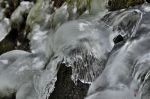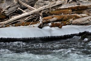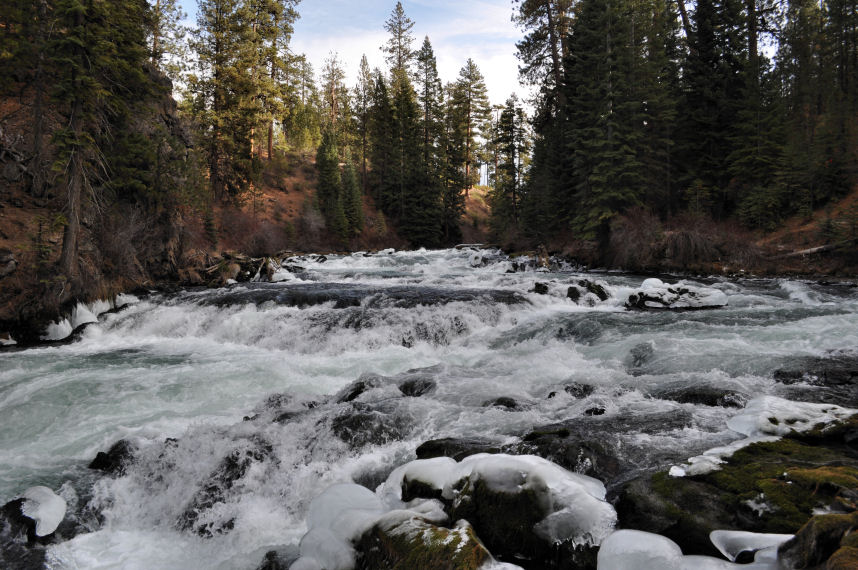 After that, we went to hike a trail along the Deschutes River to Benham Falls. I snapped dozens of photos of the ice in the river, as it formed irresistible bubbles and icicles around the edges of the tumbling water. On the way back from the trail, we stopped at a vista across a wide valley where the region’s volcanic history was starkly evident. We saw a long and wide lava flow area (still black and crumbly!) with mounds raised over long-absent hotspots. Signs advertised cave exploration and museums available in the summer months, so we agreed to come back again when it’s warmer.