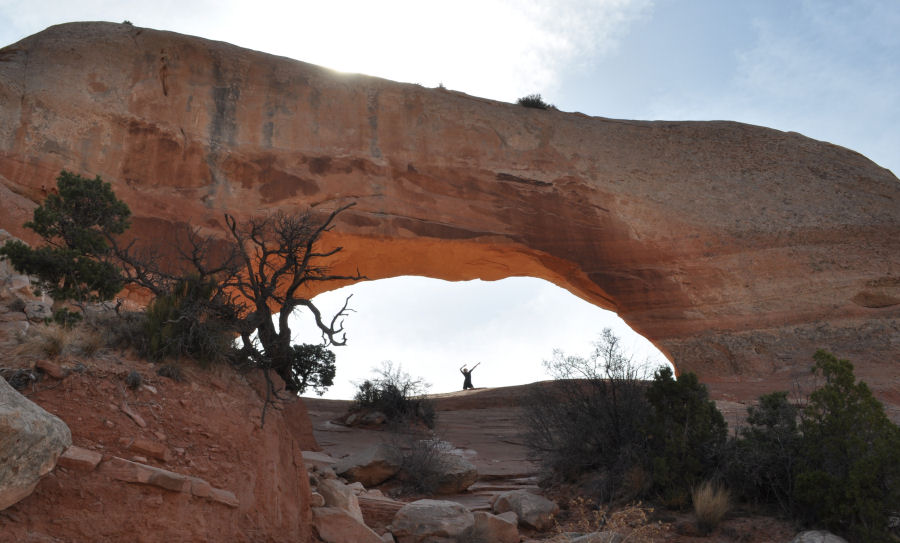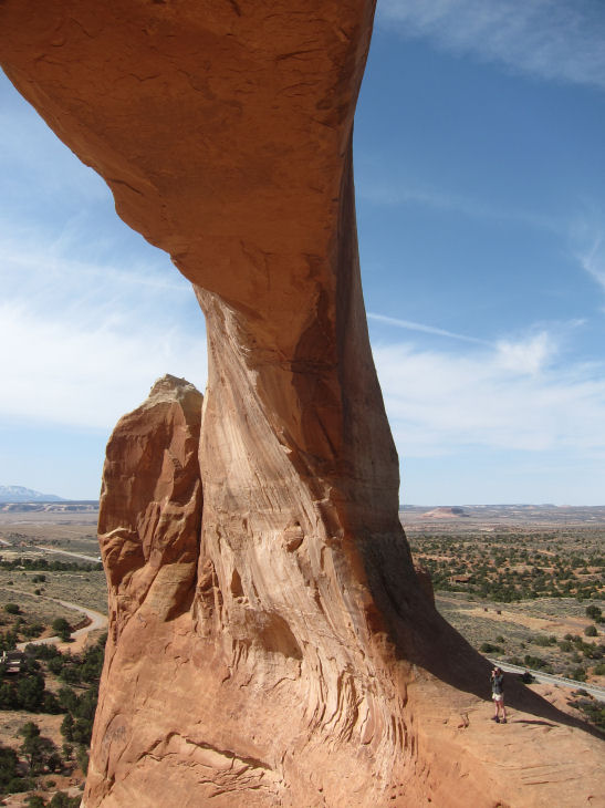 Right there on the highway, we spotted Wilson Arch, and pulled over to explore our first arch of the trip. We girls had not yet had a chance to “get our rock legs” and were a bit wobbly and unsure on the slickrock. Slickrock, as I discovered in Oak Creek last summer, is best climbed by planting your feet flat against the slope and moving up by walking. Once you achieve the trust of your feet and the rock, it’s easy, but at first it is non-intuitive. We climbed around and through the arch and had some spectacular views of the wide open desert.