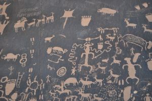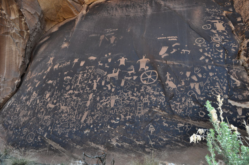 We left the main highway 191 and turned onto highway 211 toward the park. On the way, the views were captivating, and I had to drive in front, since it was easier for Arno to keep track of me and my many stops for photos. Our best stop was Newspaper Rock National Historic Site. Miguel was excited about it and wore his Newspaper Rock T-shirt in honor of the visit, but was still feeling very sick and not able to enjoy much of the journey or the sights. The rock is so-named because it is a large wall filled with petroglyphs. Ancient writing of course touches the anthropologist in me, and I can’t help but stare in awe. The petroglyphs were applied by different indigenous American people over a 2000-year time span, and so one can imagine they tell many stories together on one page. In the Navajo language, the rock is called Tse’ Hane’ for rock that tells a story.