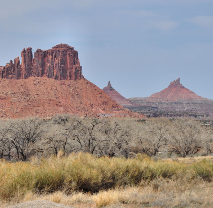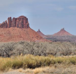 Farther along the highway, we were treated to better and better views of North and South Six-Shooter Peaks. They are framed by sheer red cliffs and bound by blue skies above and silver grey winter trees below. What stunning country!