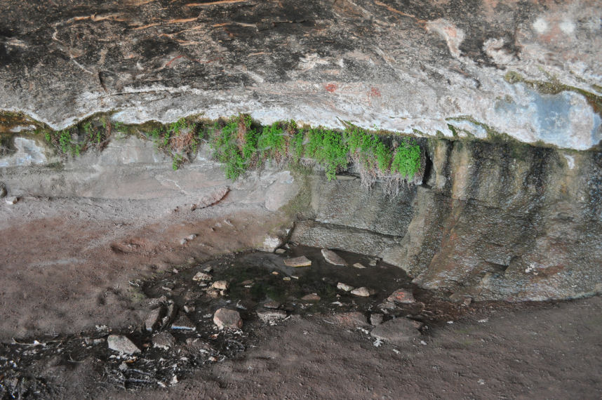 Around a few more bends in the trail, we reached the spring, and we could actually taste the moisture in the air. A trickle of water seeps from one long horizontal crack that follows the path in the cliff wall beneath a huge overhanging rock ceiling, making a flat pool that seeps across the rocks. Wet sand stretches away from the sheltered cave-like area, and ends at the inevitable dry sand after only about 10 feet. Where moisture seeps from the horizontal crack, fern fronds dangle in a lovely and unexpected green curtain of freshness and life in that dry world. Stark red pictographs adorn the cold stone walls around the spring. Doubtless there because of the spring. Some ancient person’s thanks and recognition to his Deity, and probably in hopes of invoking further watery blessings in the future.