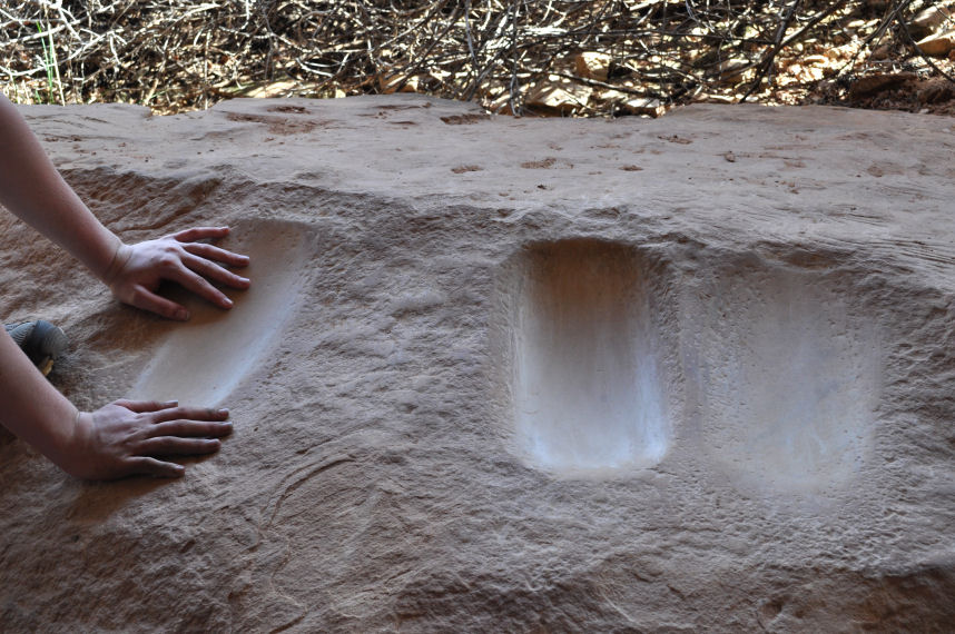 Mere steps beyond the moist cool air was another sign of people long gone: troughs worn into stone, likely by Indian women grinding grain into flour. Diego was compelled to touch the indentations. He must have had the same thought as I: a long time ago, someone ancient and beyond reach touched this same stone.
