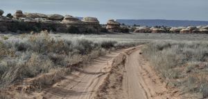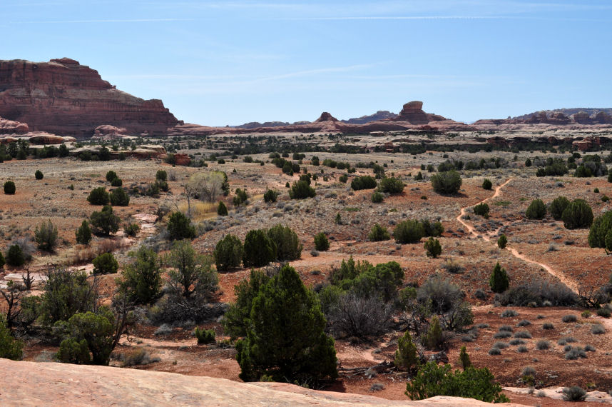 We left her there, and Miguel, who had finally rested enough to feel somewhat human, wanted to come along. We left on a dirt road from behind the Needles Visitor Center along Salt Creek. It is a designated four-wheel drive road and the truck has 4WD. We decided to try and find this overlook point that a woman at the Visitor’s Center had told us about. There is a wide spot where we were told to pull over, and then we wandered around till we found the trail. A little way down the trail there was a sign. Good call, that. The sign was not visible from the road, and probably keeps many people away from this spot.