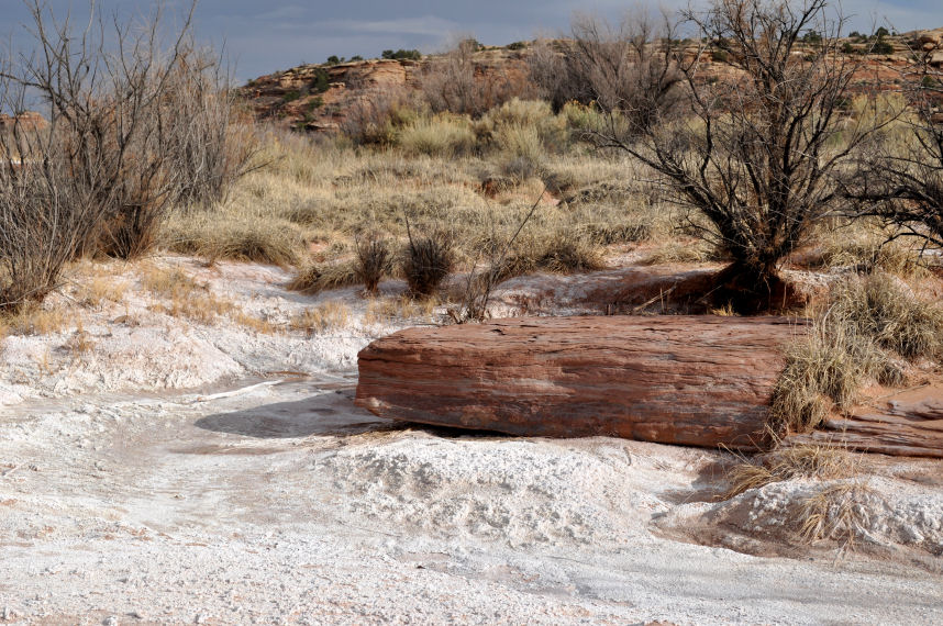 We walked back to the truck up the creek. The high mineral content of this water caused deposits to collect on the creekside until it looked like a recent snow had come through. Blades of grass, the gravel on the shore, and rocks at the waterline were crystalline white and sparkling when the sun made its tentative bursts to life.