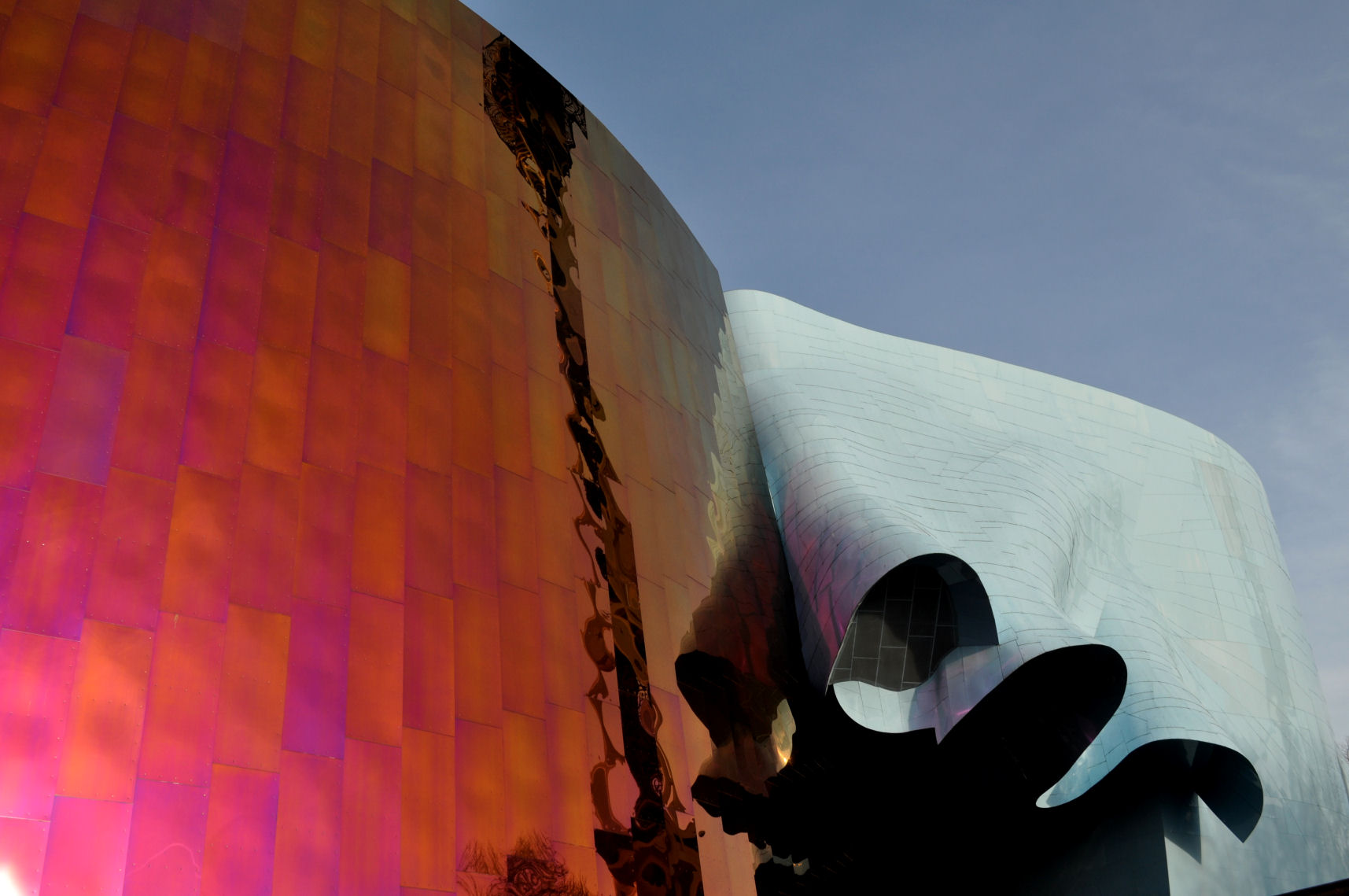 We passed some other interesting buildings, then took the monorail to the EMP Museum. Ian says he rides the monorail every day in his commute to work. How fun! The EMP Museum is a work of art in itself. Frank O. Geary designed the building to evoke the spirit of Rock n’ Roll. Well, I didn’t read it as rock music per se, but I did get a distinct sense of colour, movement, and fun. It actually evoked more Disney than Hendrix, but don’t tell Geary I said that. Far from insubstantial, I found the building design truly eye-popping. Astonishing curves rose to unlikely heights and imbalances. I can’t believe I’ve never seen this place before. The monorail went right through a gap in the museum!