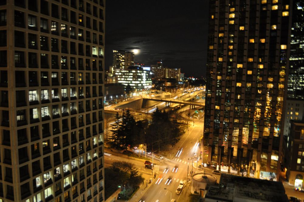 We got out and stood at the railing with the other folks, and gazed out across blossoming cherry trees and syringa, across the city lit up in the setting sun, and all the way to the snow-capped and majestic Mt. Rainier on the horizon. The bay waters wrapped around the west side of the city and glanced reflections back to us.