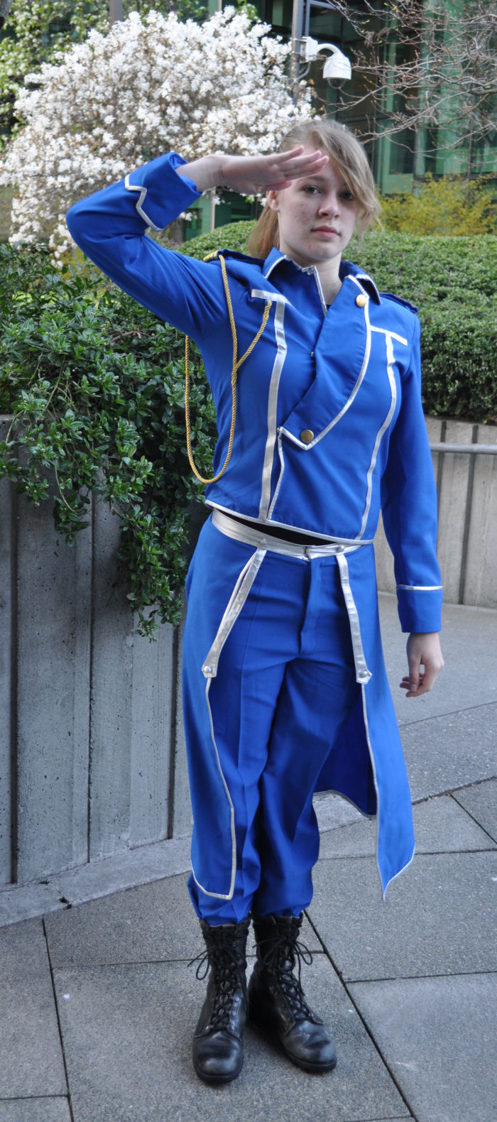 Ian met us at the hotel while Tara was dressing as Riza Haweye from Fullmetal Alchemist. We walked with her to an entrance to the convention, and watched her for a little while to see how it would go for her. There was a large gathering of people. Many with orange, yellow, and red curvy horns – from an anime I am not familiar with. Tara walked to the outer edge to watch what was happening. There were the usual shockingly short miniskirts, the always-present black capes with red clouds from Naruto. In about three minutes, she was approached by a tall, thin boy dressed as Colonel Roy Mustang. In the story, Riza is the Colonel’s bodyguard.