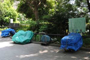 The homeless people were the most amazing thing I saw in that park. Isn’t that a riot? They kept their cardboard boxes and tents tidy and organized. There was a little tent community in one part that had tidy paths and no trash or smell whatsoever. As I passed, one man carried a soda can to a recycling bin in the park, then he walked back to his cardboard box. Homeless people who had left the area bundled all their belongings into a compact little package, covered in tarpaulin, and then attached to a fence with a bungee cord so it wouldn’t blow away in the wind. There was no one to watch the bundles. Their things would have been stolen in the U.S.