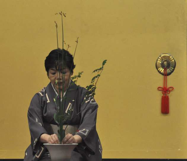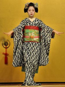 We were dropped at our hotel, where I took a quick shower (this hot sticky weather requires extra hygiene efforts), and then caught the hotel shuttle to downtown Kyoto, the Gion district. With uncanny luck, I walked about a mile, directly to the theatre I was looking for, paid for my ticket, and sat down with 30 seconds to spare before the 6 pm show. It was a demonstration crafted just for tourists: about 10 minutes each of Chado (tea ceremony), Koto (Japanese Harp), Kado (flower arrangement), Gagaku (court music), Kyogen (a traditional comedy – very funny despite having little idea what they were saying), Kyomai (dance performed by Maikos), and Bunraku (a puppet play where the puppeteers are on stage with the puppets). The Maikos are Geishas in training. I would have enjoyed more a complete show of any one of these things, but with a lack of time and the savvy to find a proper show, this one was a great substitute.