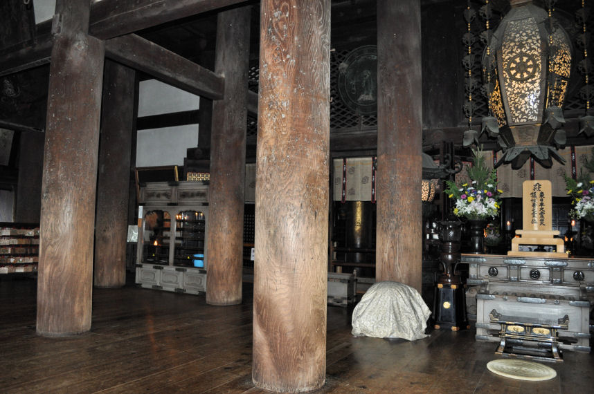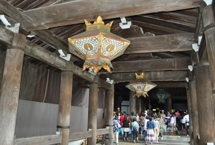 wooden columns and *huge* wooden timbers making up the temple’s architecture. During our visit, we were not able to go in, but we walked on the balconies surrounding it, and were able to look in and absorb its rich interior design and adornments.