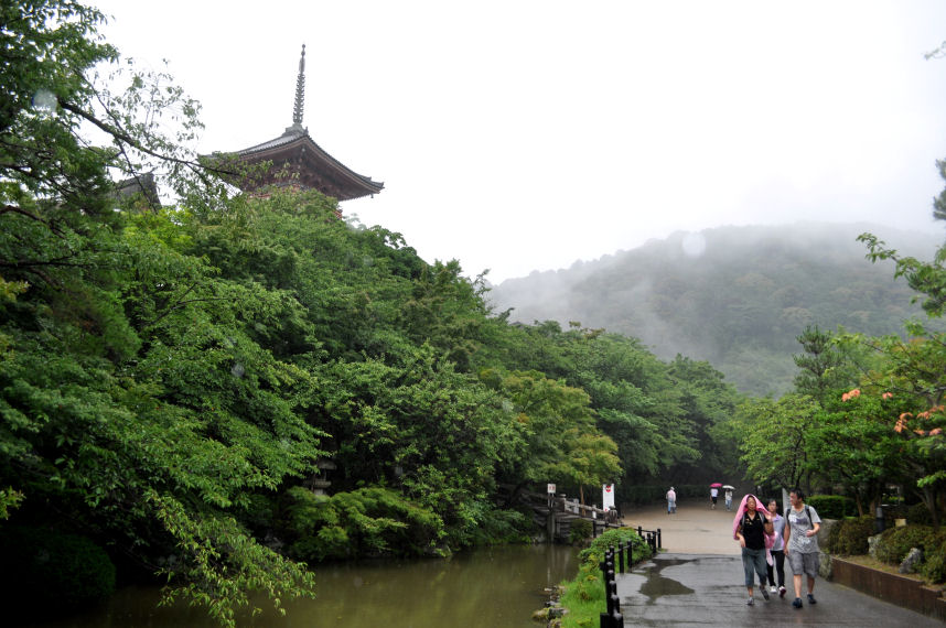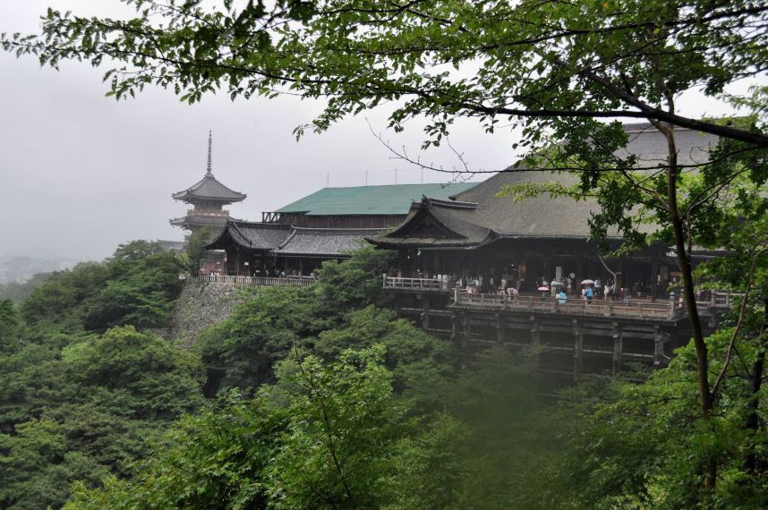 Our first stop was the Kiyomizu Temple, set in an indescribable magical atmosphere in the rain. The temple is perched in the mountains around Kyoto. Rain pulled shreds of grey stratofractus down into the valleys, while the tops of the mountains remained obscured. Since Kuomizu Temple perches above treetops, and the horizons disappeared into clouds, it looked as though the temple was floating over the forest.