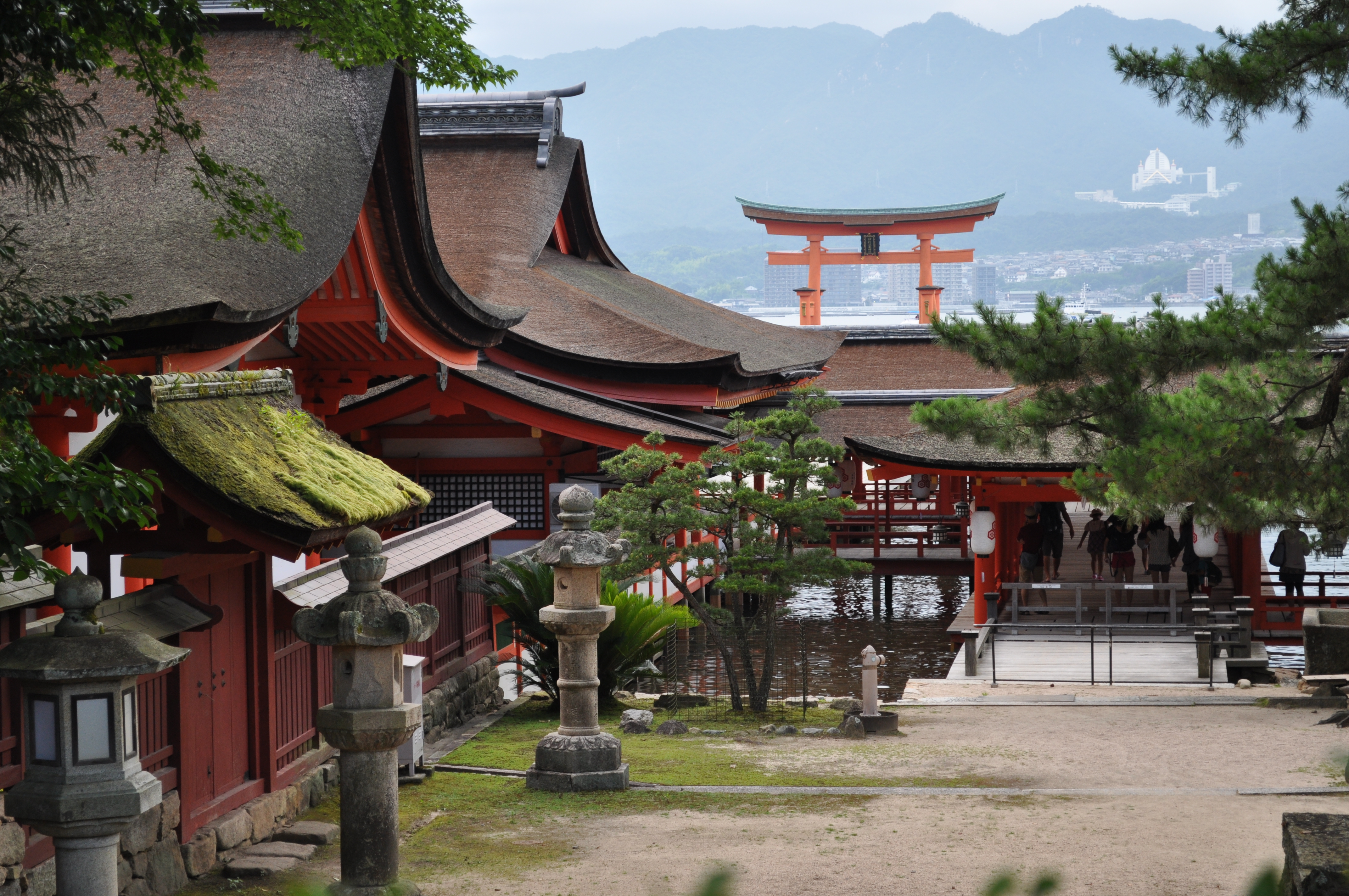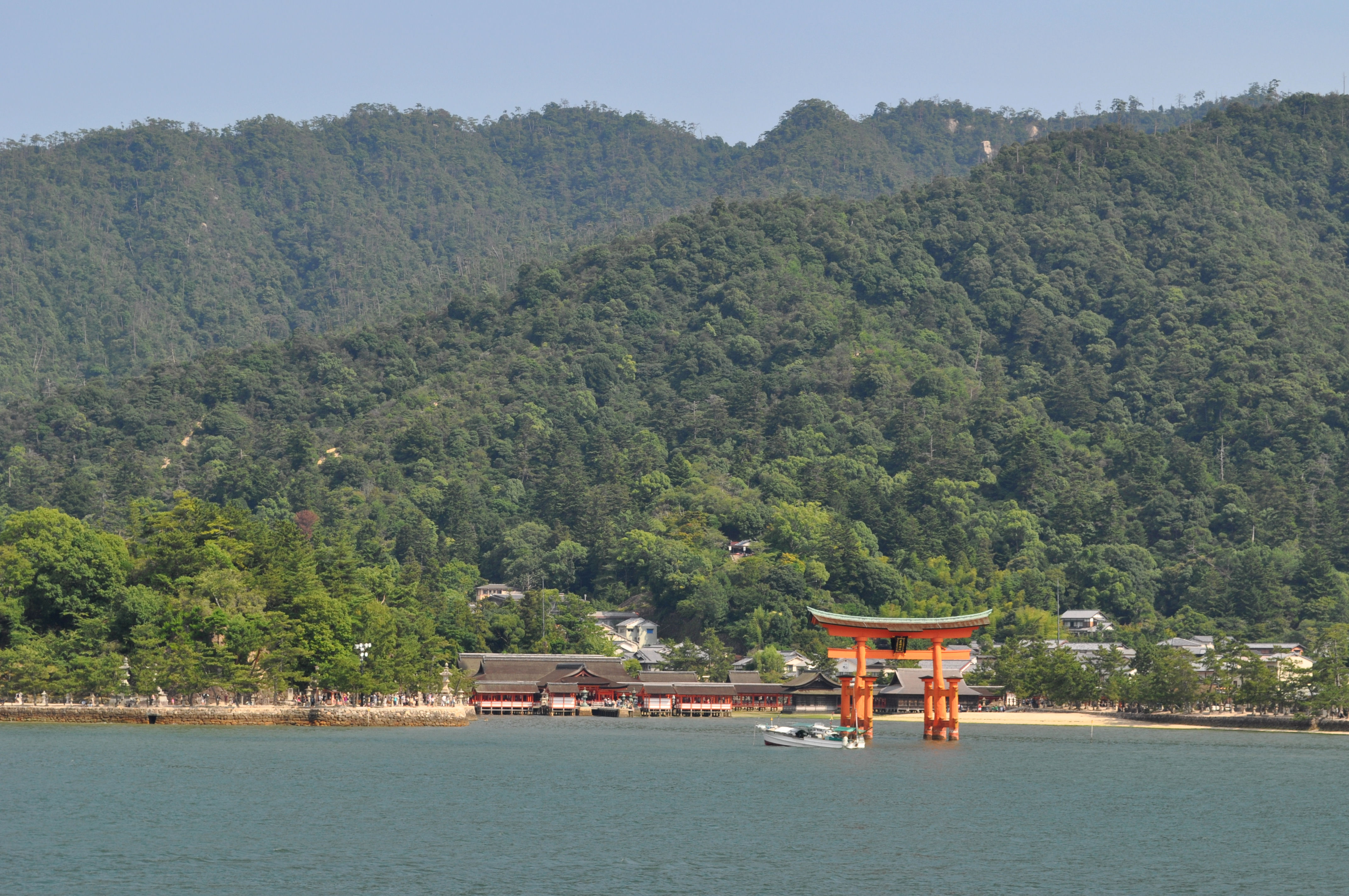 Soon we spotted the huge red torii in the waters of Miyajima island, which is just offshore and a bit south of Hiroshima. The island is famous for its shrines, and the primary one is Itsukushima Shrine, for which this torii is the gate, or spiritual entrance. If you’ve only seen one photo of a giant red torii in Japan, it was probably this one. From the ferry, the famous torii of Itsukushima Shrine is quite noticeable, and drew my eye as we drew closer and closer.