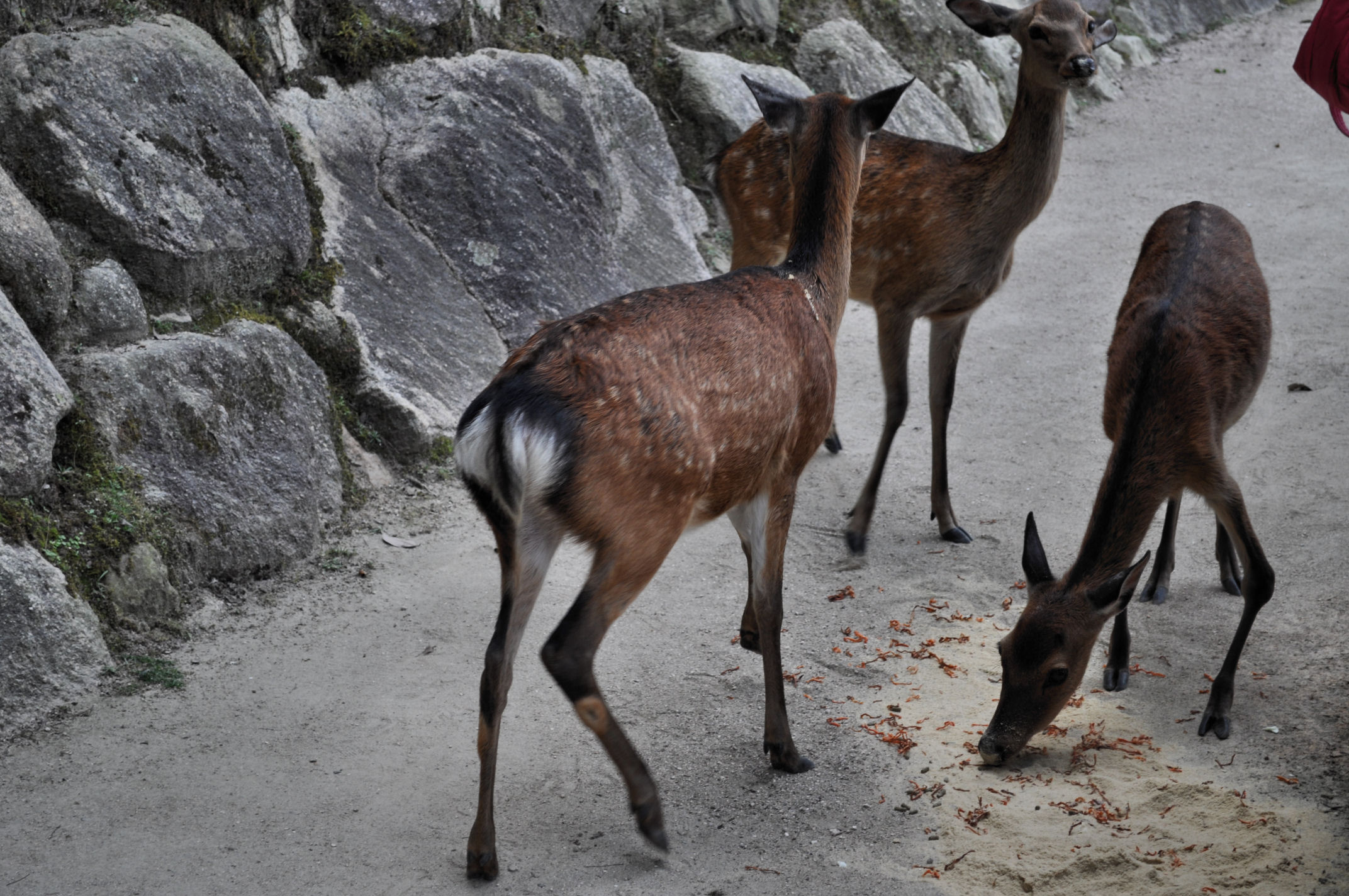 At one point, a woman showed up with some kind of food. It looked like rabbit pellets mixed with powdered chicken feed. She spread it all over the ground and deer showed up in herds to eat it. But a lot of the powder was wasted when it got mixed into the sand. I watched two rear up on hind legs and bash each other with their hooves, fighting over the powdered food in the sand.