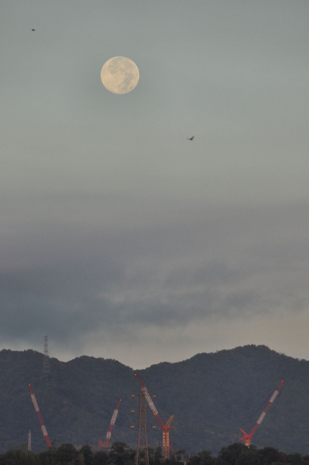 August 2 was a full moon. The window of my room at the Kinati Inn on Marine Corps Air Station Iwakuni is perfectly positioned to capture views lit by the rising sun. And thus, perfectly situated to snap some shots of the full moon. At first I was cursing the unnatural-looking construction towers in the foreground. But now that I look again, I like the effect.