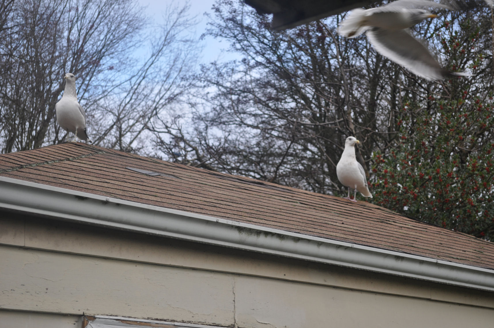 I’ve got nuthatches, chickadees, Western Scrub Jays, crows (who prefer leftover scraps I throw out), and sometimes surprise visitors like the ruby crowned kinglet and the gorgeous red shafted Northern flicker who, despite her size, can perch gracefully on the feeder ledge, hanging most of her body below and selecting seeds one at a time. The other day, when I tossed out the remains of Tara’s gingerbread house, we were visited by seagulls, who look enormous next to the others.