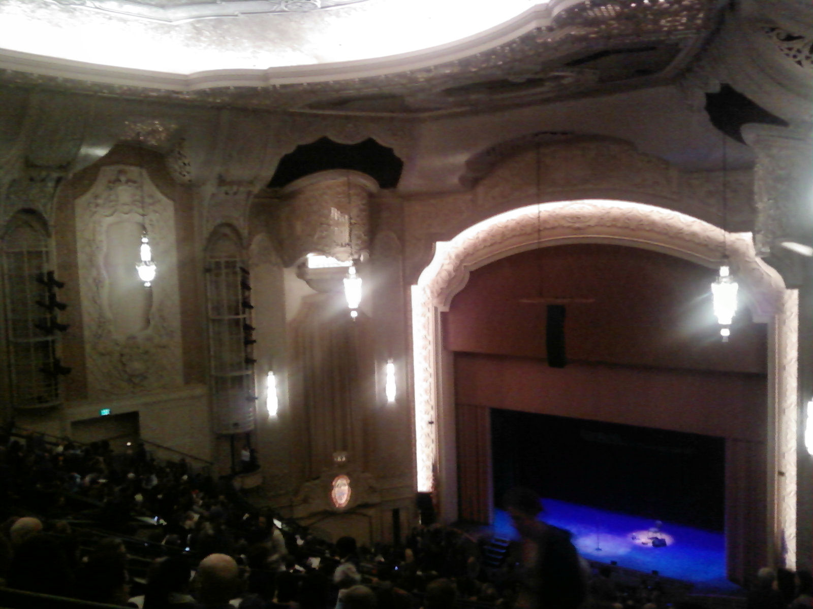 The first character of the evening was the grand and elegant Arlene Schnitzer Concert Hall, built in 1928. Outside, one can’t help but feel a thrill at the 65-foot high PORTLAND sign all lit up in actual bulbs, and the broad marquee announcing the show, just like the old days. Inside the decor involves every decorative surface, and is set off with chandeliers casting a candle-like glow. The multiple steep banks of balconies in the theatre itself hold quaintly small seats, as old theatres are wont to do. The effect brought to mind rather modern images though, such as an IMAX theatre or the Grand Convocation Chamber in Star Wars, with audience members stacked above each other at an angle to provide a great view of the blue-lit stage below.