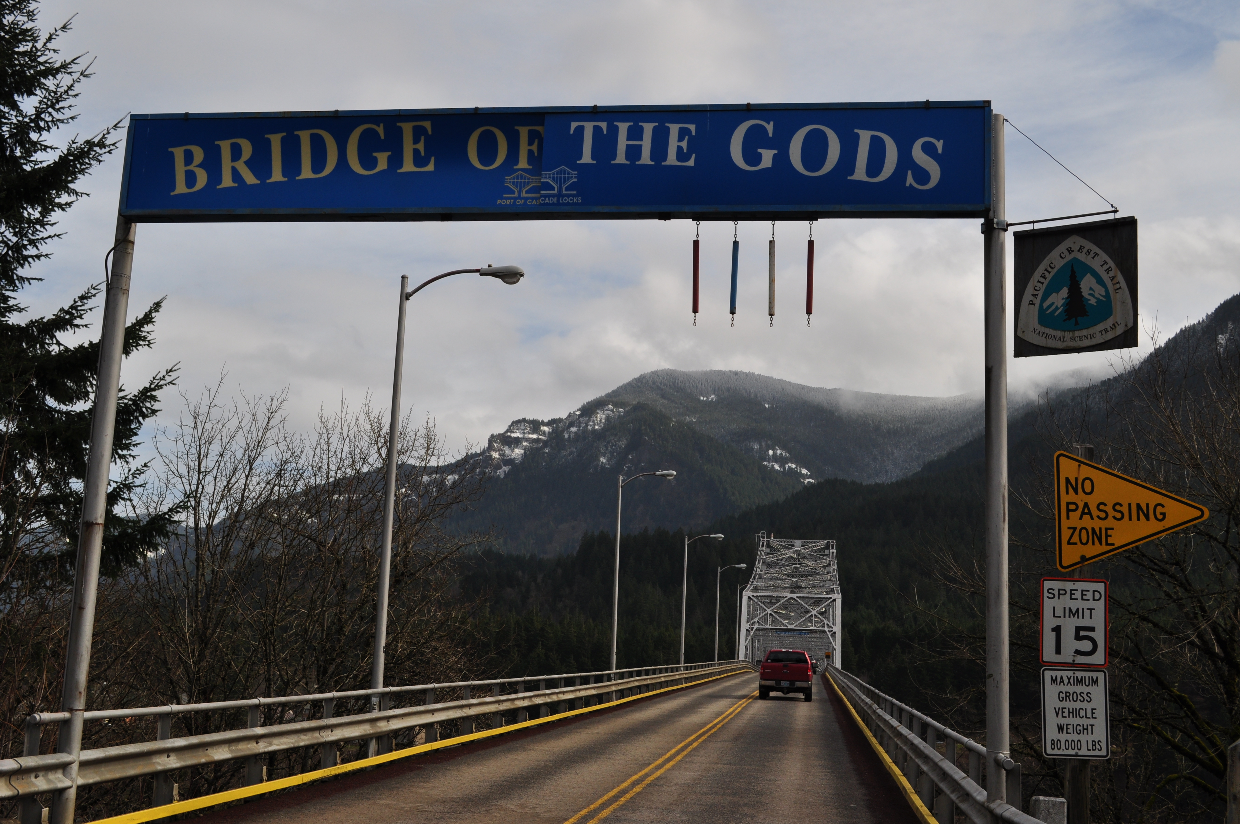 We stopped before returning home along the Bridge of the Gods because we wanted to see how pedestrians would cross the great Columbia. There was no footpath, but it was clear the Pacific Crest Trail came out at this place. Further, the sign across the entrance to the bridge also declared it to be part of the PCT. Arno pulled out his magic phone and soon had the answer from the Internet: hikers walk across the bridge and pay a 50 cent toll like everyone else. The speed limit is 15 miles an hour, so that makes up for the apparent danger of having no safe place to walk other than in traffic.