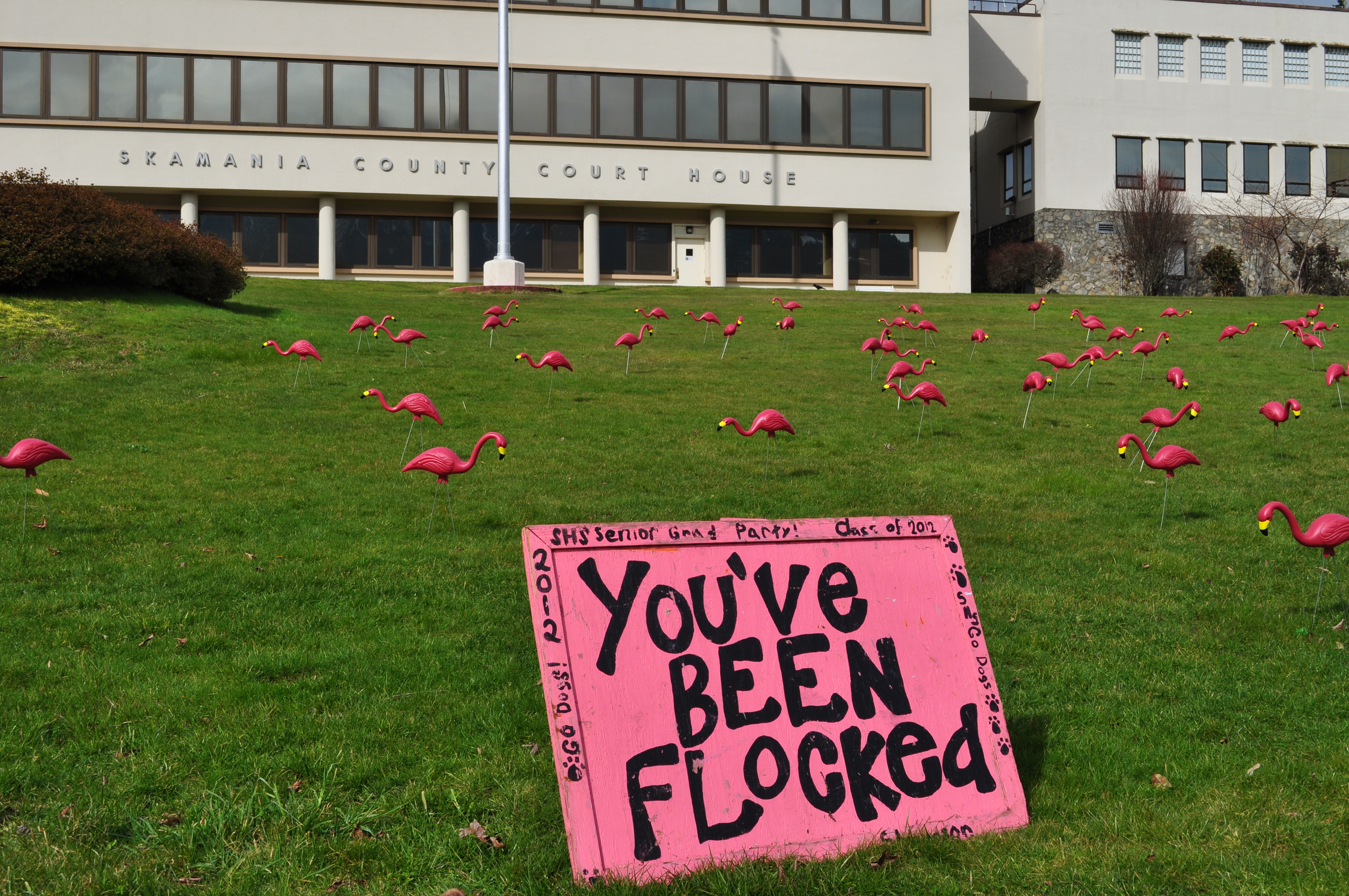 Hungry by this time, we went into Stevenson for lunch and had a lucky find at Big River Grill, approved by the Sturgeon General, where we had scrumptious salmon cakes for an appetizer and could hardly settle on what to eat since nearly everything on the menu sounded perfect.  Across the street, the Class of 2012 had flocked the Skamania County Courthouse.