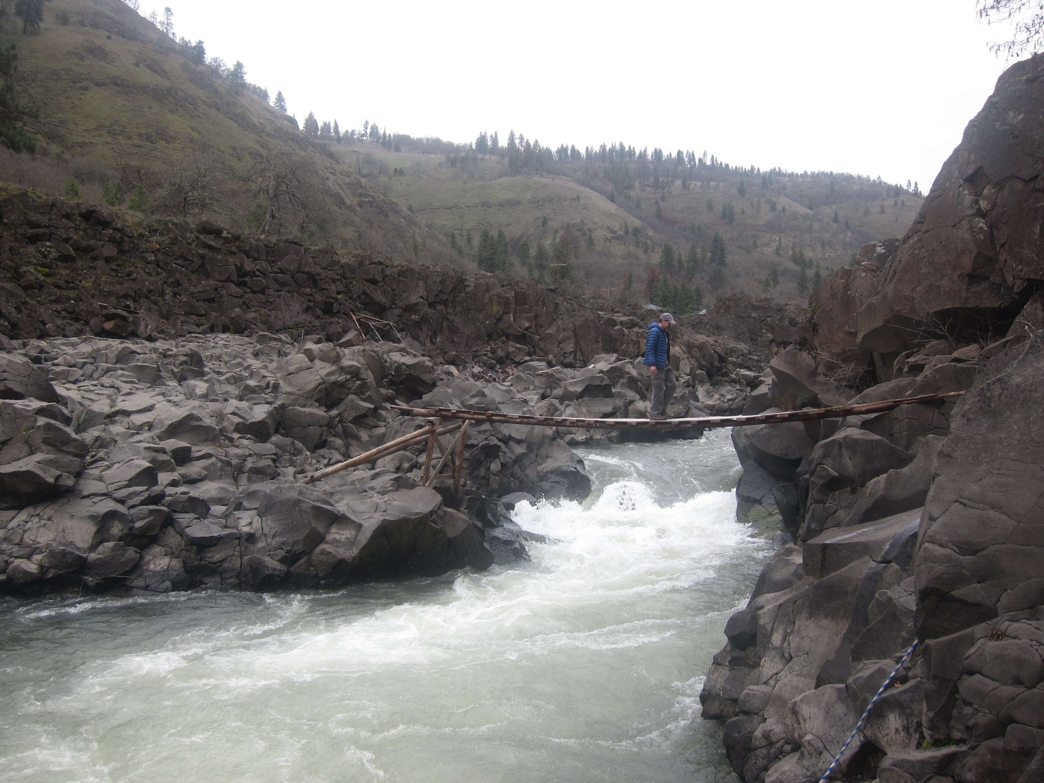 I peered over the steep ledge and was more convinced that they must be fishing platforms built by local Indians. I had seen a photo or two of Indians standing on wooden platforms above rushing river water, waiting to spear fish, but I couldn’t remember when or where. Perhaps that famous photo of Celilo Falls was my resource. Arno and Diego, the climbers, instantly felt that we needed to go over the side and get down to the water.