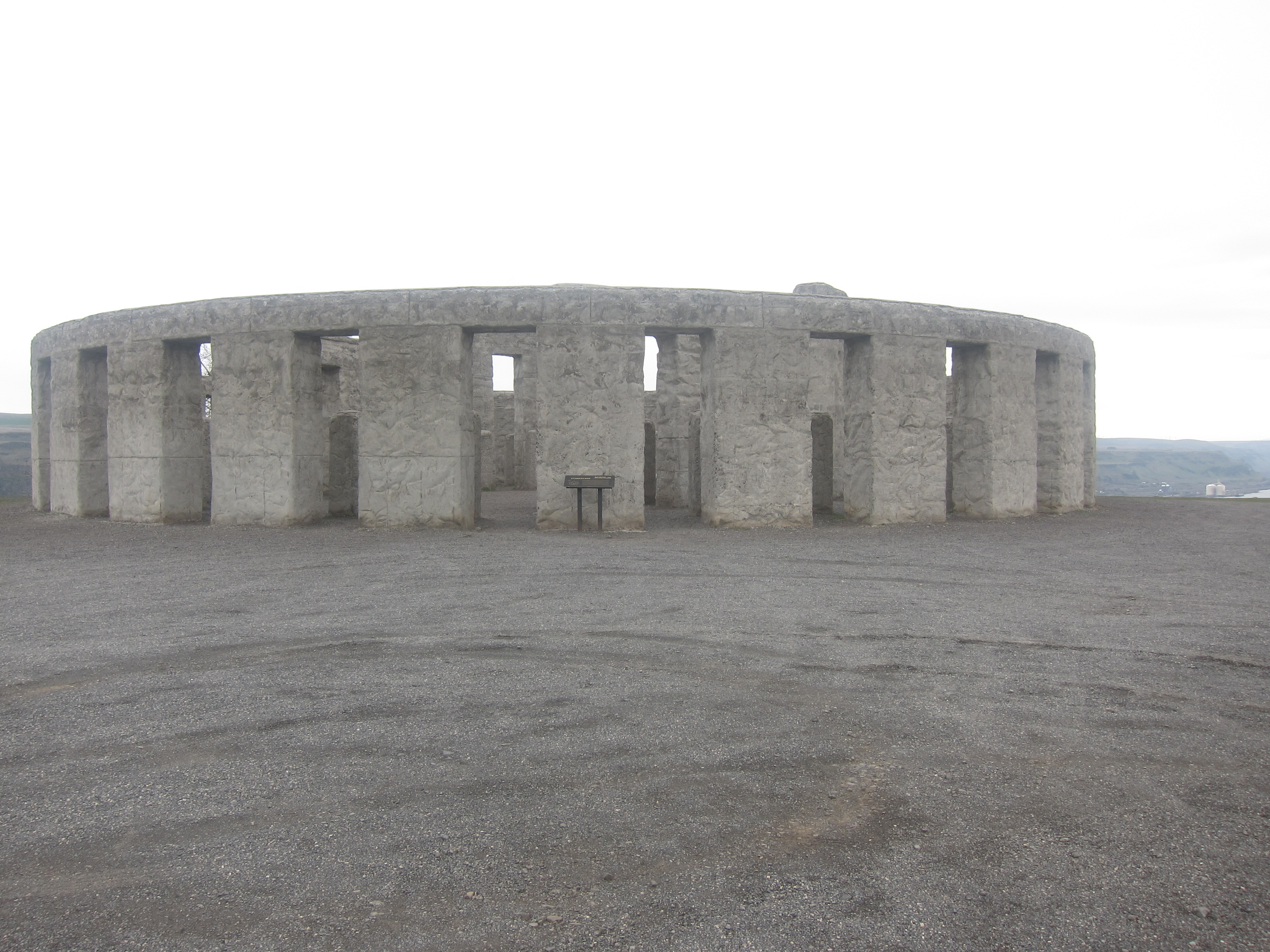 Stonehenge replica made of concrete and perched on a ledge above the Columbia River.