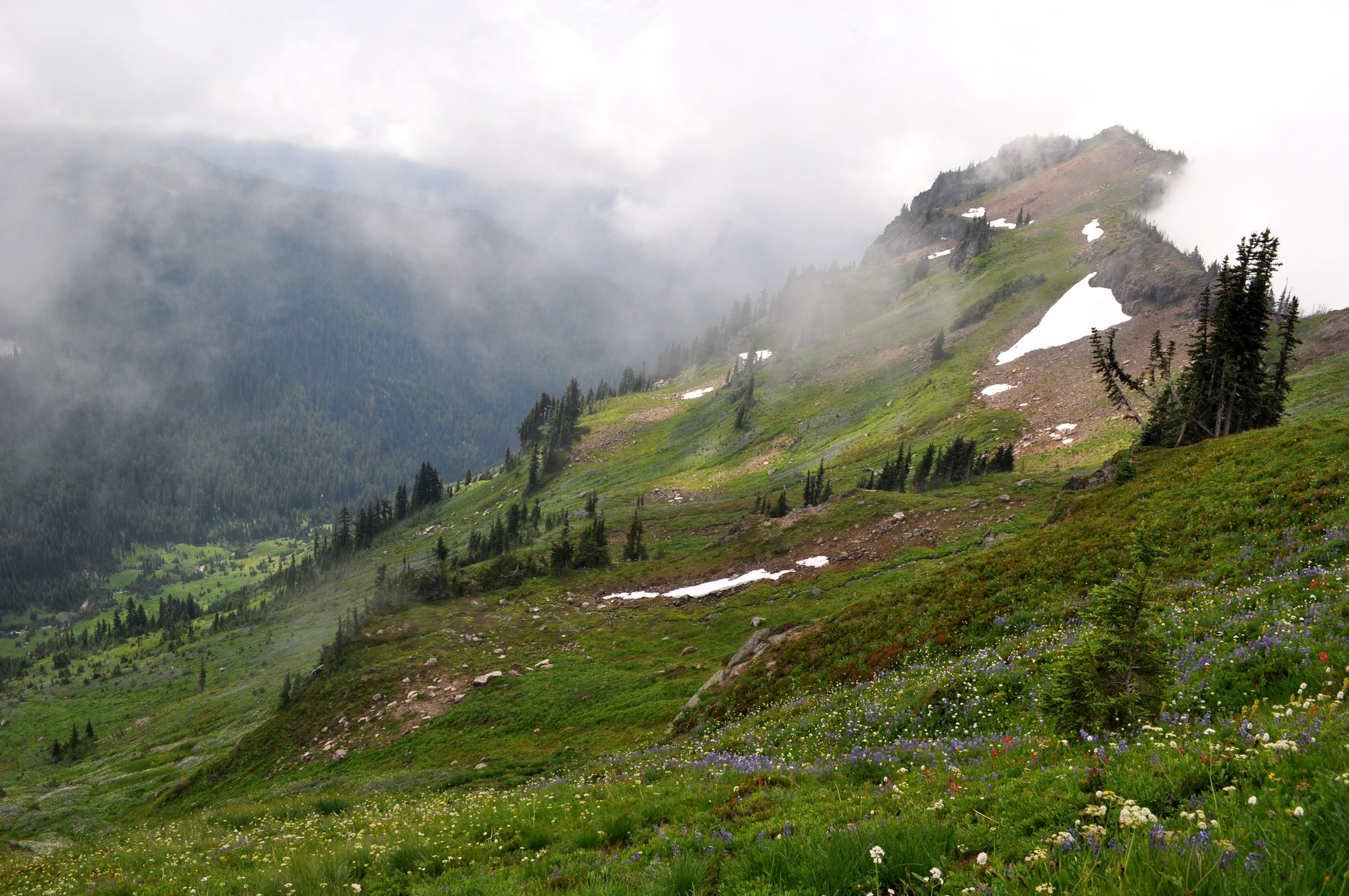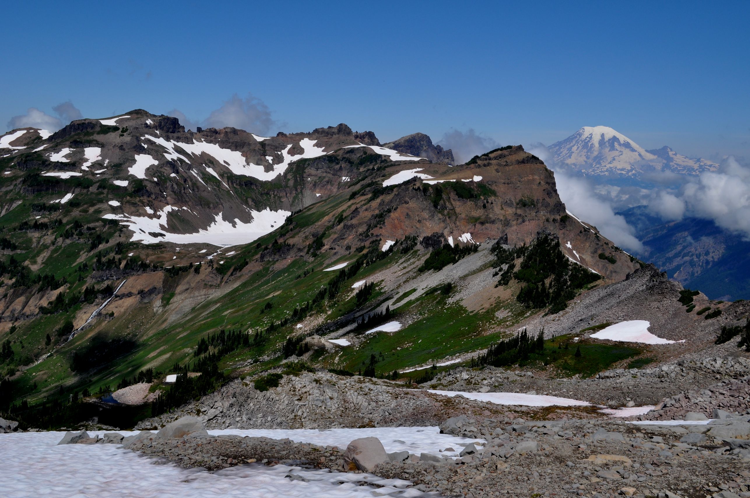 We climbed across large snow fields (the trail crosses the Packwood Glacier), over many gurgling creeks, across meadows and beneath rocky peaks. We soon spotted Goat Lake. It’s totally frozen over still. In August! I was glad we hadn’t made it all the way there to camp, as we had considered. Then I got my visual stimulation payoff before I even had to climb the dang mountain peak. Mount Rainier! Holy Mother that’s a beautiful volcano. Three volcanoes in one day! Look at the crazy steep valley.