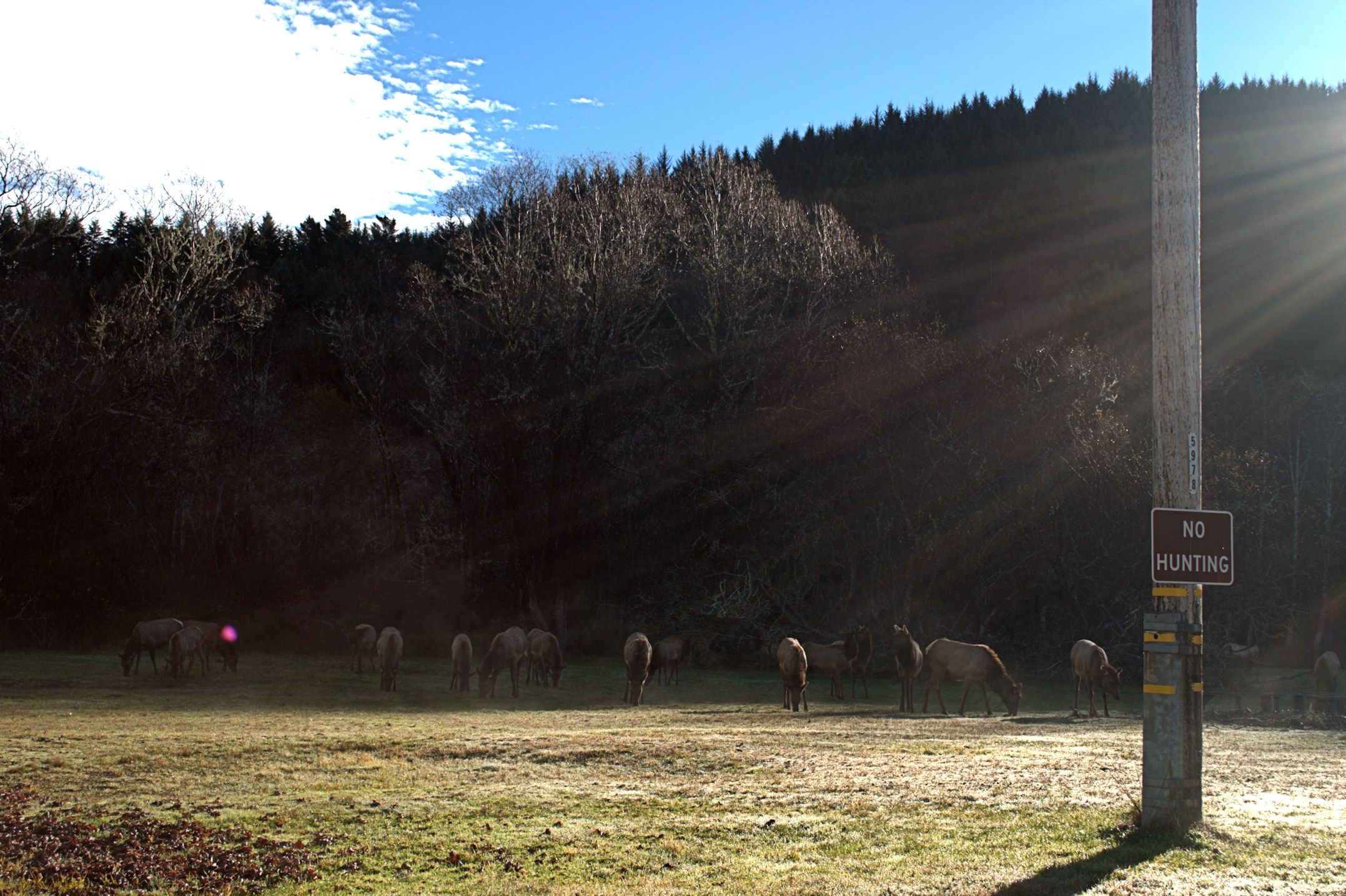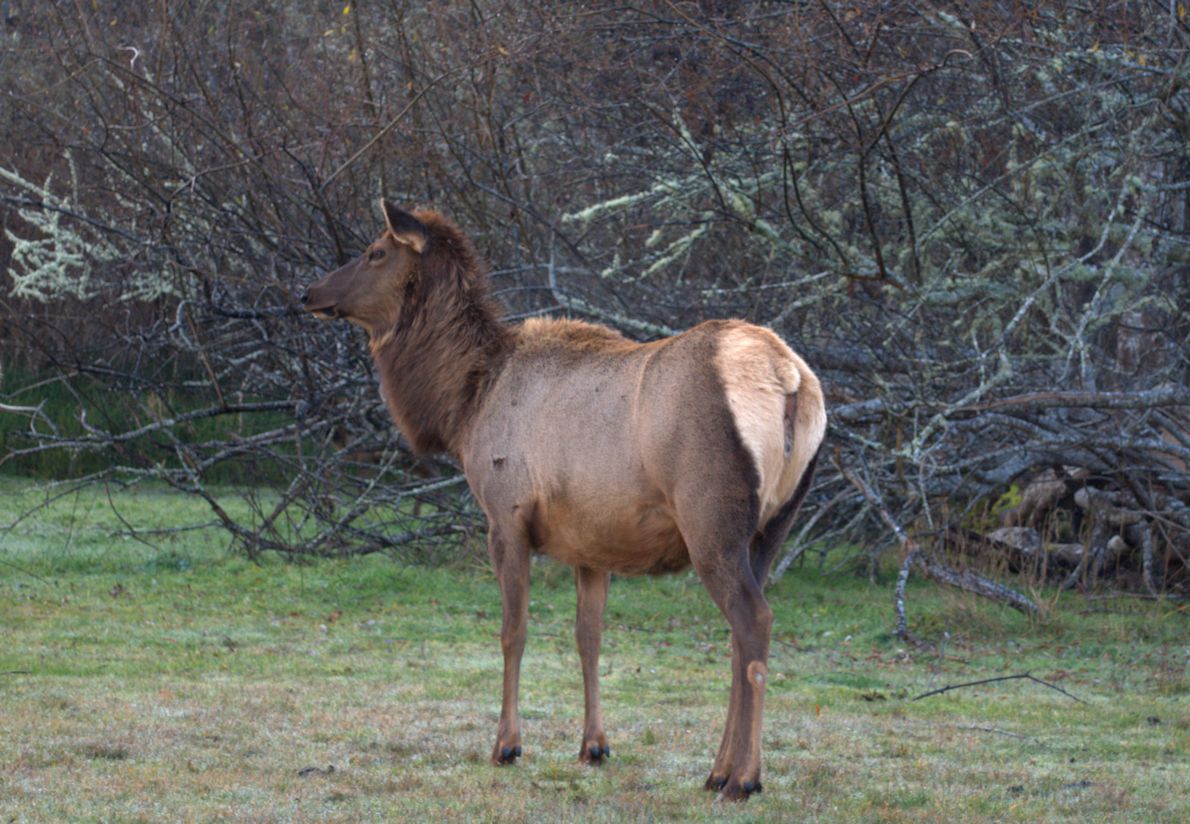 At Thomas H. Kuchel Visitor Center in Orick, CA, we talked with a Ranger and learned about a back road through Jedediah Smith State Park. We realized that by taking scenic routes, we could get up close and personal with the trees, but not spend too much time hiking through the woods and make ourselves late for check in at the B&B. Before we reached the redwoods, however, we were distracted by a group of Roosevelt Elk grazing near the highway.