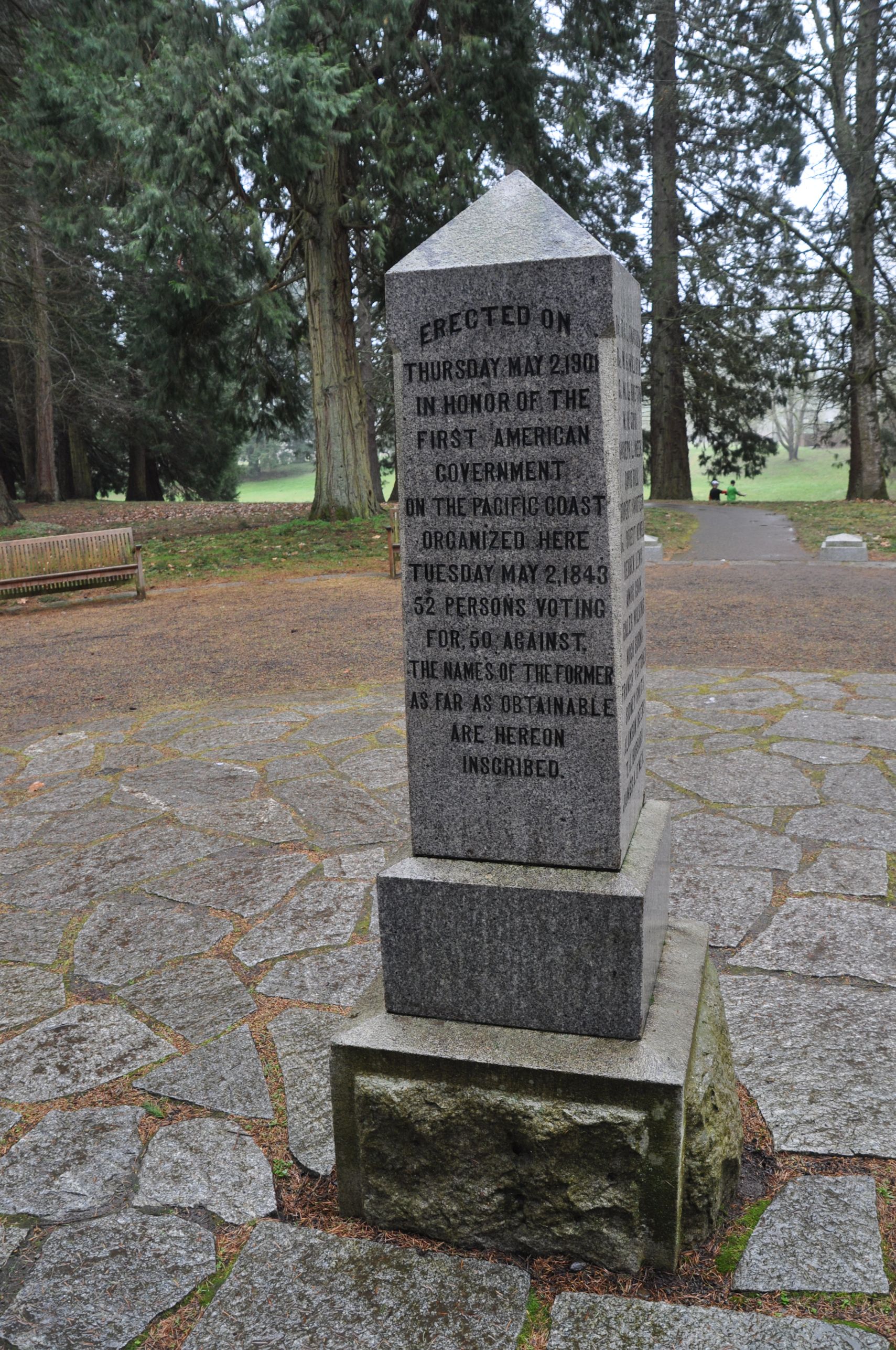 At the location where the vote was held, a granite marker is placed. The monument was installed in 1901 and attended by Francis Xavier Matthieu, one of the 52. It was a very busy spot when we were there, since the Champoeg 30K run was in progress in the wicked cold rain. The monument site was also the race finish, and it was filled with the usual tents with music playing and freebies like keyrings and energy bars, and inside the Pioneer Memorial Pavillion, water bottles and pies were being handed out to runners.