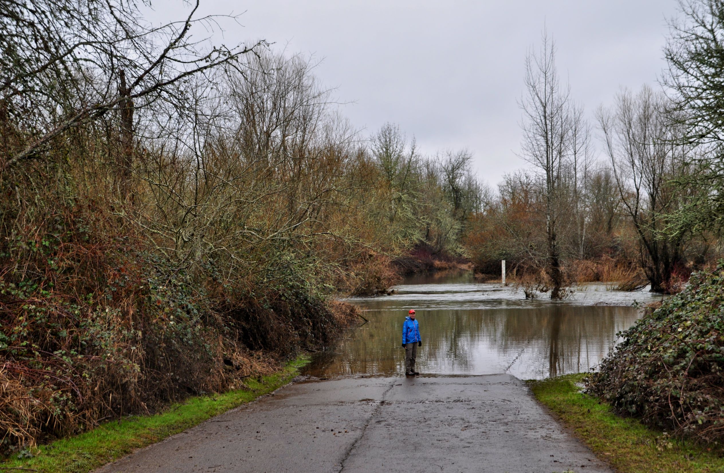 We reconnected with the paved road, and immediately saw why the road was closed. The path of the water here mimics a river, and this is what I was talking about with the map: it’s a historic path of the Willamette. Not the river, but a narrow curved lake on mild weather days. This day the water was raging through, however.