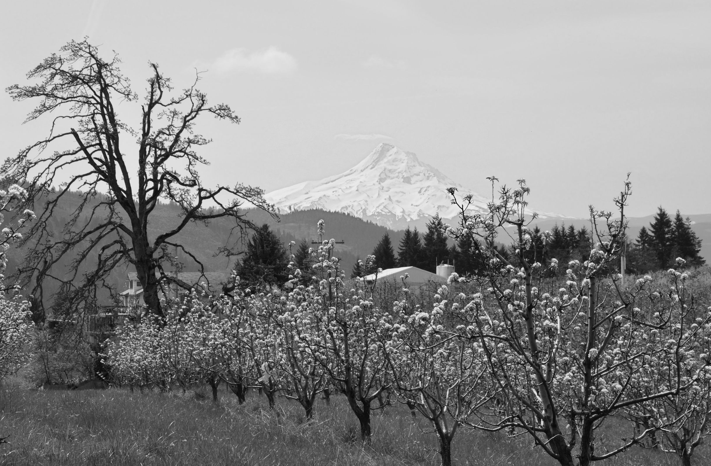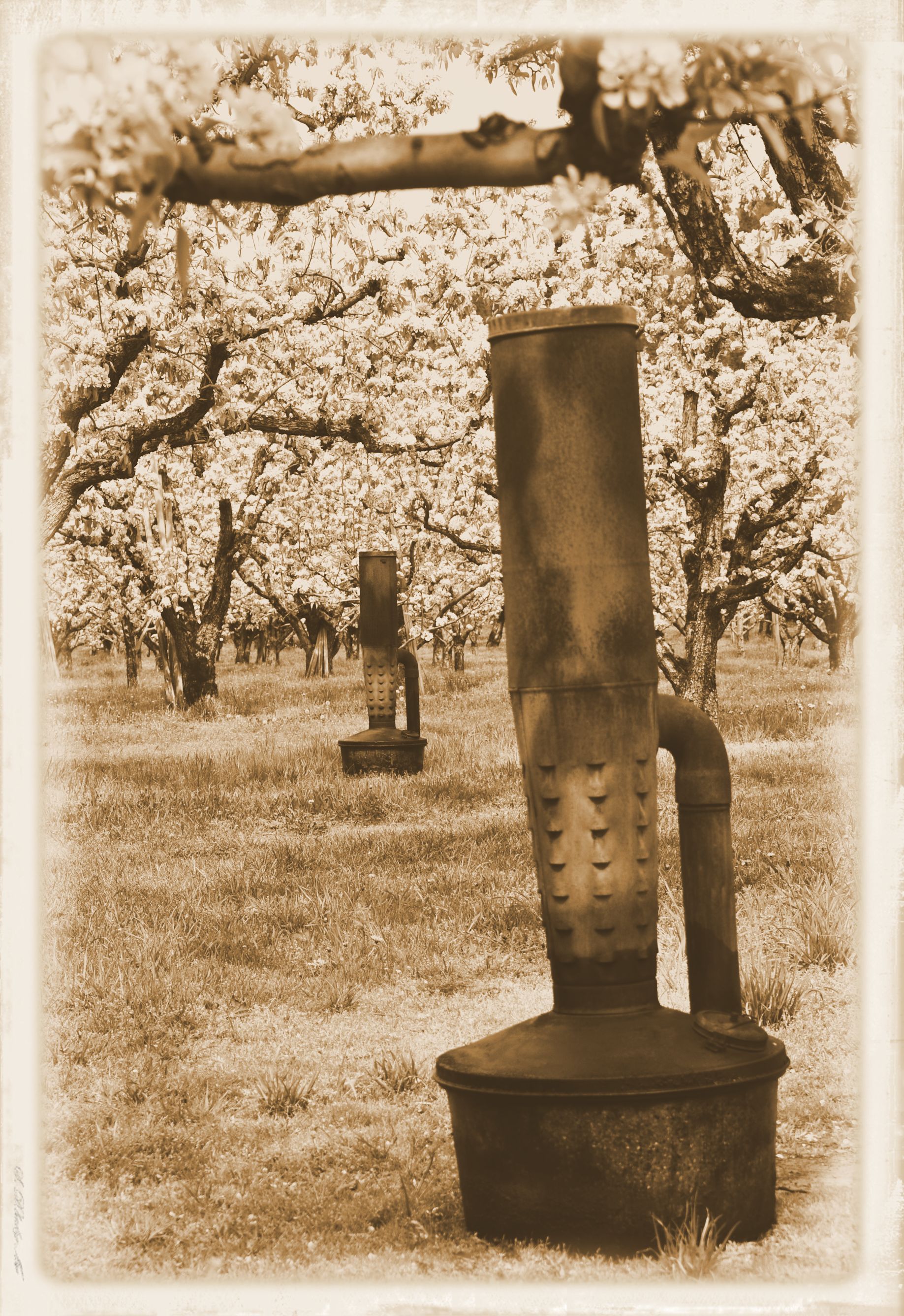 The last photo gives a better sense of what it looks like to see heaters in the orchards. It also gives you a preview of my next post: Hood River blossoms in full colour! When all my images from the day are bursting with brilliant spring greens, and pink flowers, and white snow, and red rust, and copper barns, and black highways…it was hard for me to be brave and post these grey photos today. But I’ll make up for it in the next post.
