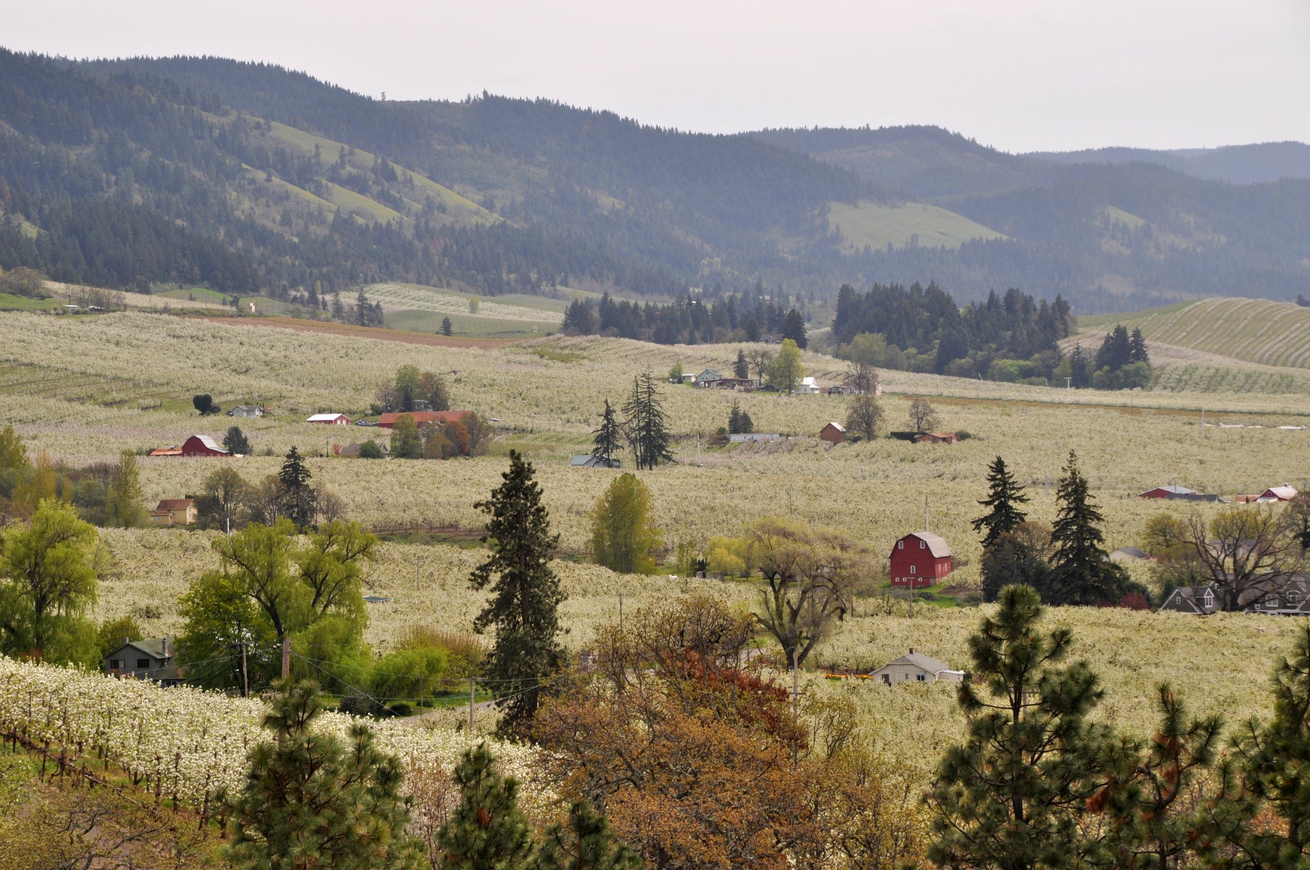 The Hood River Valley is famous for its fruit. The valley is in the Columbia River Gorge on the Oregon side. The dominant fruits are apples, pears, and cherries, and orchards have been producing fabulous bounty for over 100 years.